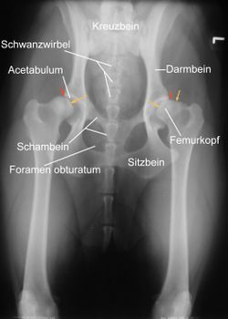 Differentialdiagnosen Diagnostisch muss eine Hüftgelenksdysplasie von anderen Störungen des Skelettsystems abgegrenzt werden. Neben Knochenbrüchen und Luxationen sind dies bei großen Hunderassen vor allem Tumoren der Knochen, welche im Bereich des Femurs relativ häufig auftreten. Bei kleinwüchsigen Tieren muss die aseptische Femurkopfnekrose (Legg-Calvé-Perthes-Krankheit) abgegrenzt werden. Weiterhin treten bei schnellwachsenden Hunden häufig Ablösungen des Gelenkknorpels auf (Osteochondrosis dissecans), die ebenfalls schmerzhaft sind. Ferner sind Erkrankungen des Kniegelenks (z. B. Kreuzbandriss), Beckenbrüche und Erkrankungen der Wirbelsäule (Bandscheibenvorfall, vor allem bei kleinen Hunderassen) sowie Instabilität am Lenden-Kreuzübergang der Wirbelsäule (Cauda-equina-Syndrom, häufiger beim Deutschen Schäferhund) auszuschließen. BehandlungMan kann HD nicht heilen, sondern nur das Auftreten klinischer Symptome und das Fortschreiten der Krankheit hinauszögern oder die Schmerzen reduzieren. Je häufiger der Hund bestimmte Bewegungsabläufe ausführt, desto schneller verschleißt die Hüfte. Zu diesen Bewegungen gehören vor allem jene, die die Gelenke besonders stauchen, wie Treppenlaufen, Springen auf harten Untergründen und ähnliche. Man kann dem Hund mit frühzeitigem Erkennen und richtigem Umgang mit der Krankheit ein normales Leben ermöglichen. Es gibt folgende Behandlungsmöglichkeiten: