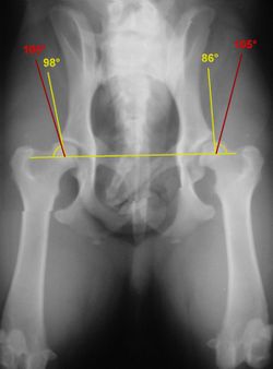 Ein wesentliches Auswertungskriterium ist der Norberg-Winkel. Er ist als der Winkel definiert, der zwischen dem Zentrum des Oberschenkelkopfes und dem vorderen Pfannenrand abgetragen wird (siehe Abbildung). Bei einem HD-freien Tier sollte er mehr als 105° betragen (rote Linien). Weitere Kriterien zur Beurteilung sind die Kongruenz von Oberschenkelkopf und Gelenkpfanne, die Weite des Gelenkspaltes, die Pfannenkontur, die Kontur des Oberschenkelkopfes sowie das Vorhandensein von Hinweisen auf arthrotische Prozesse wie walzenförmige Verdickungen des Oberschenkelhalses, Randwülste an der Gelenkpfanne, unter dem Knorpel befindliche Verdichtungen der Knochensubstanz im Pfannenbereich und die Einlagerung von Knochenmaterial am Ansatz der Gelenkkapsel (Morgan-Linie). Die züchterische Auswertung von HD-Aufnahmen ist nur von zugelassenen Gutachtern möglich, an die der Tierarzt die Röntgenbilder einschickt. |