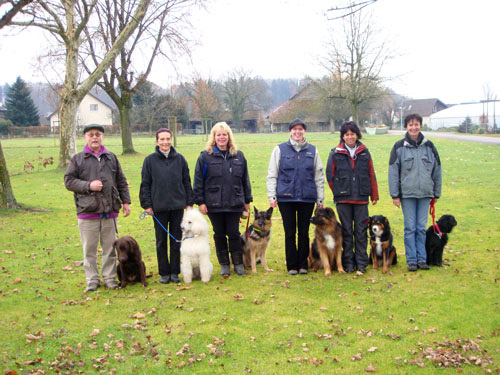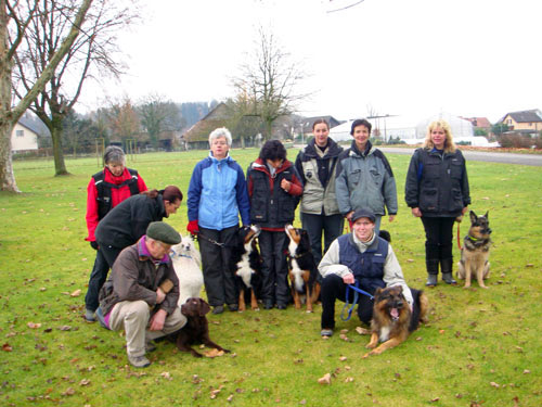 Moralische Unterstützung erhielten wir von Evi, Rita und Susanne. Evi und Susanne sind unsere Uebungsleiterinnen, Rita, auf dem Foto mit Cindy ihrer Bernen Sennenhündin, ist für das Spuren verantwortlich.